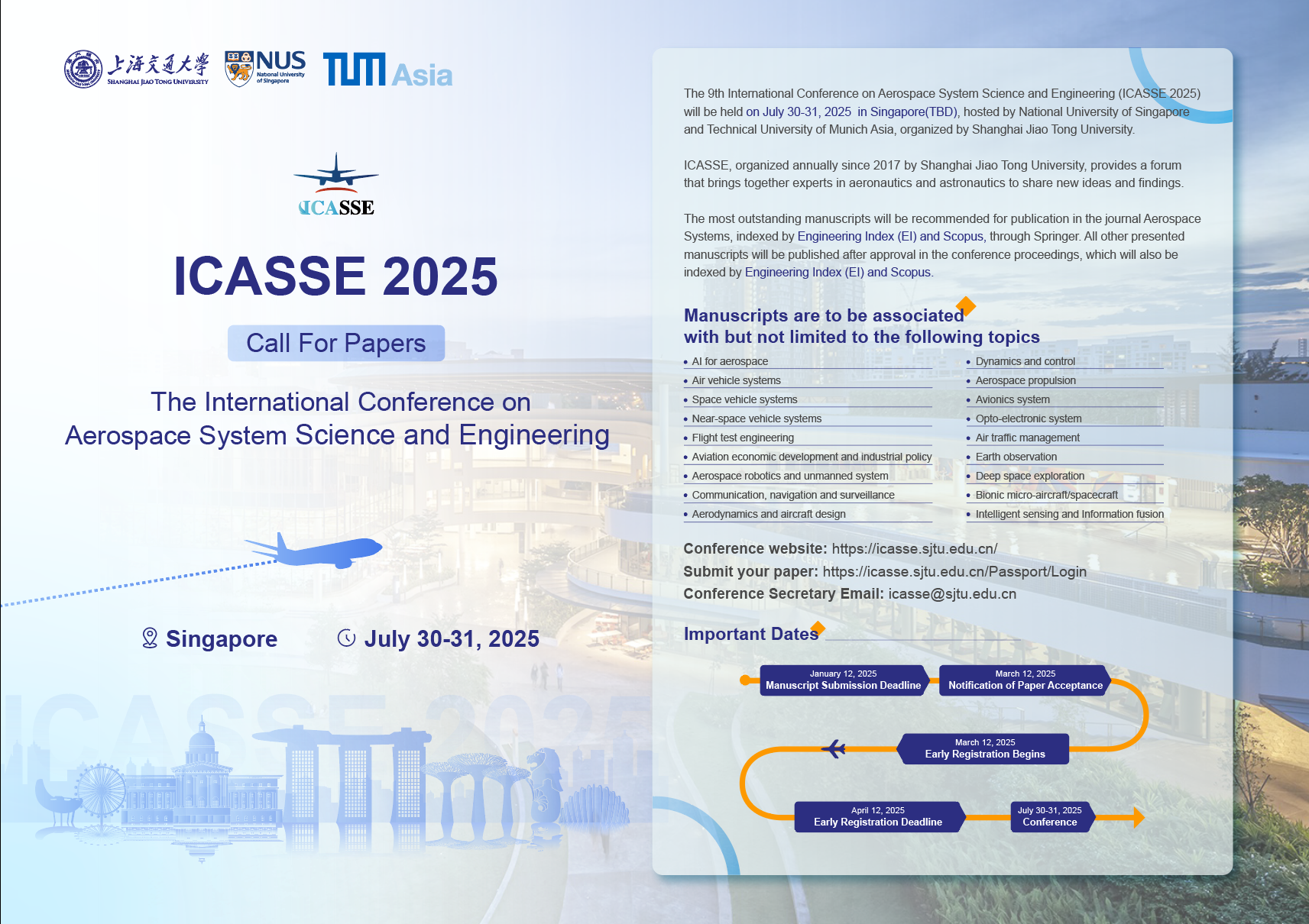 由Bevictor伟德官网主办,新加坡国立大学、慕尼黑工业大学亚洲校区联合承办的第九届航空航天系统科学与工程国际会议(The 9th International Conference on Aerospace System Science and Engineering, ICASSE 2025)拟定于2025年7月30日至31日在新加坡举行。