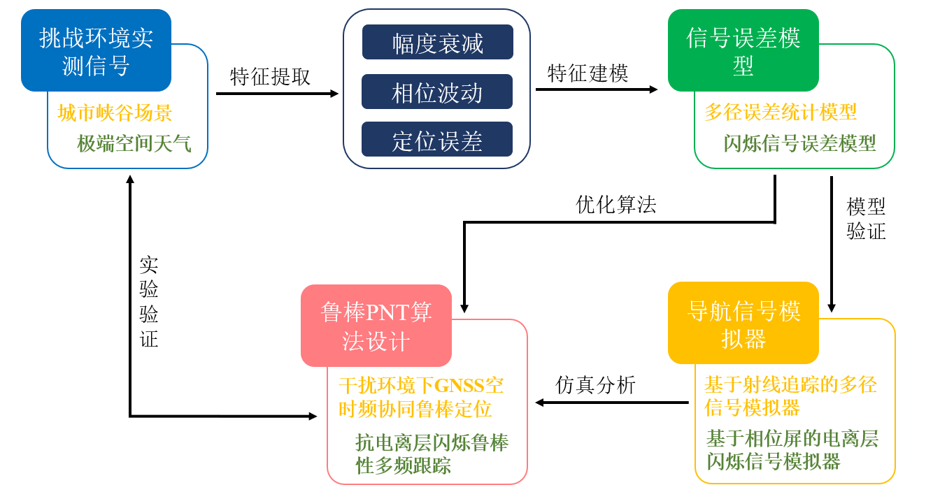 • 卫星导航信号处理。研究多路径干扰、电离层闪烁等挑战环境下的高精度卫星导航信号处理技术,旨在提升卫星导航定位精度与鲁棒性。
